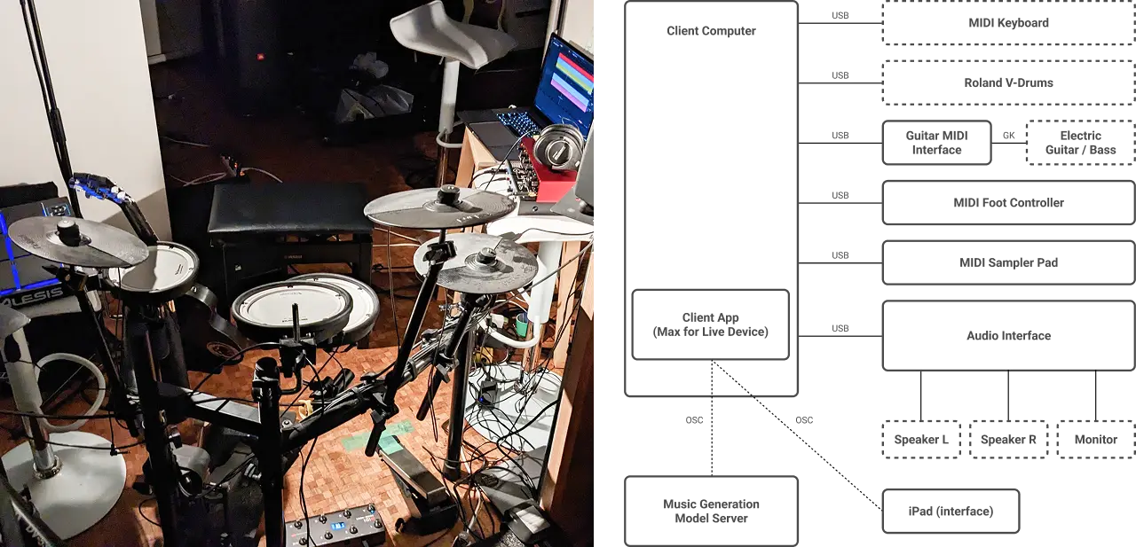 By utilizing multi-track symbolic music generation driven by an autoregressive Transformer Decoder, it enables human musicians and a computer to have an improvised jam session. The system responds to the user's playing phrases as input, and together they shape the music dynamically.